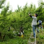 七折小梅の青い実を丁寧に収穫していました。